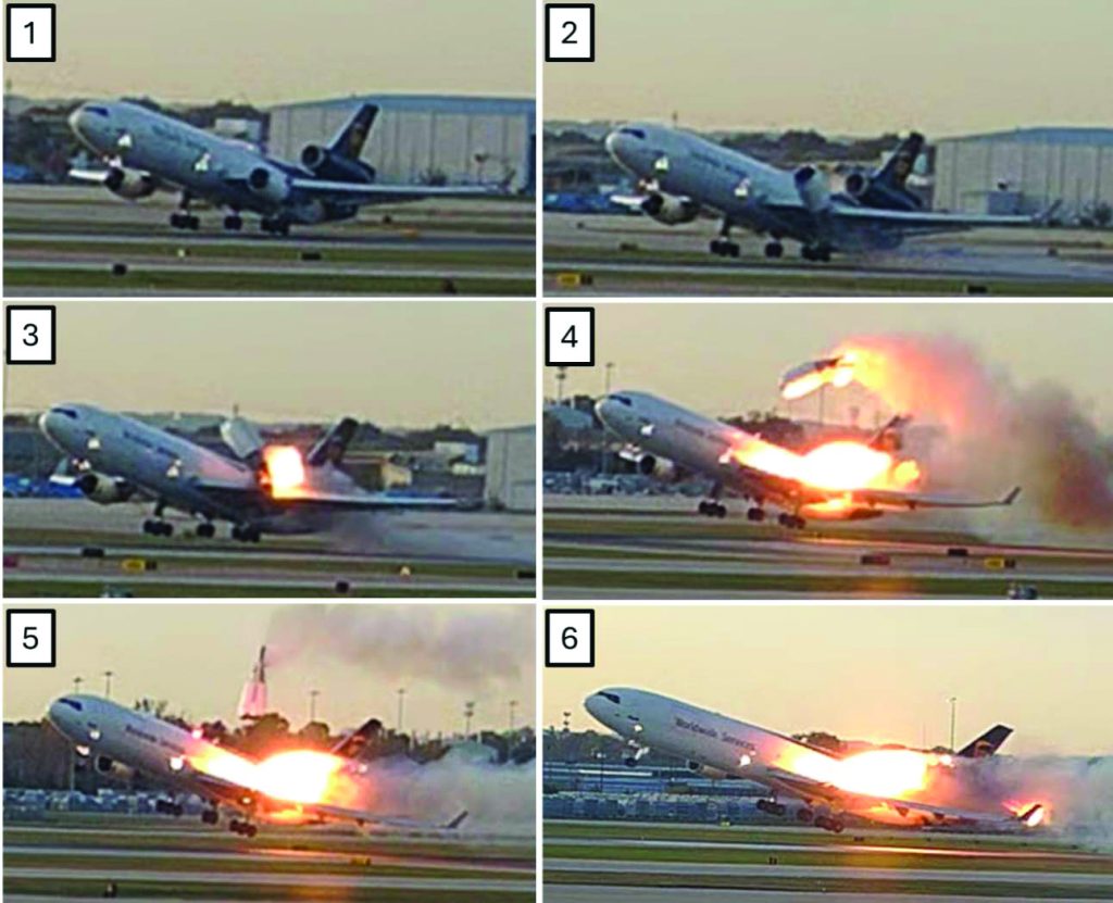 As I cruised accident reports on the inter­net today, I discovered that the prelimi­nary report on the MD-11 crash was pub­lished on multiple news sources. The number one engine and pylon separated on takeoff, with a fire igniting the left engine while it traversed above the fuselage. A fire also ignited near the left pylon attachment to the wing, which continued until the plane impacted the ground.