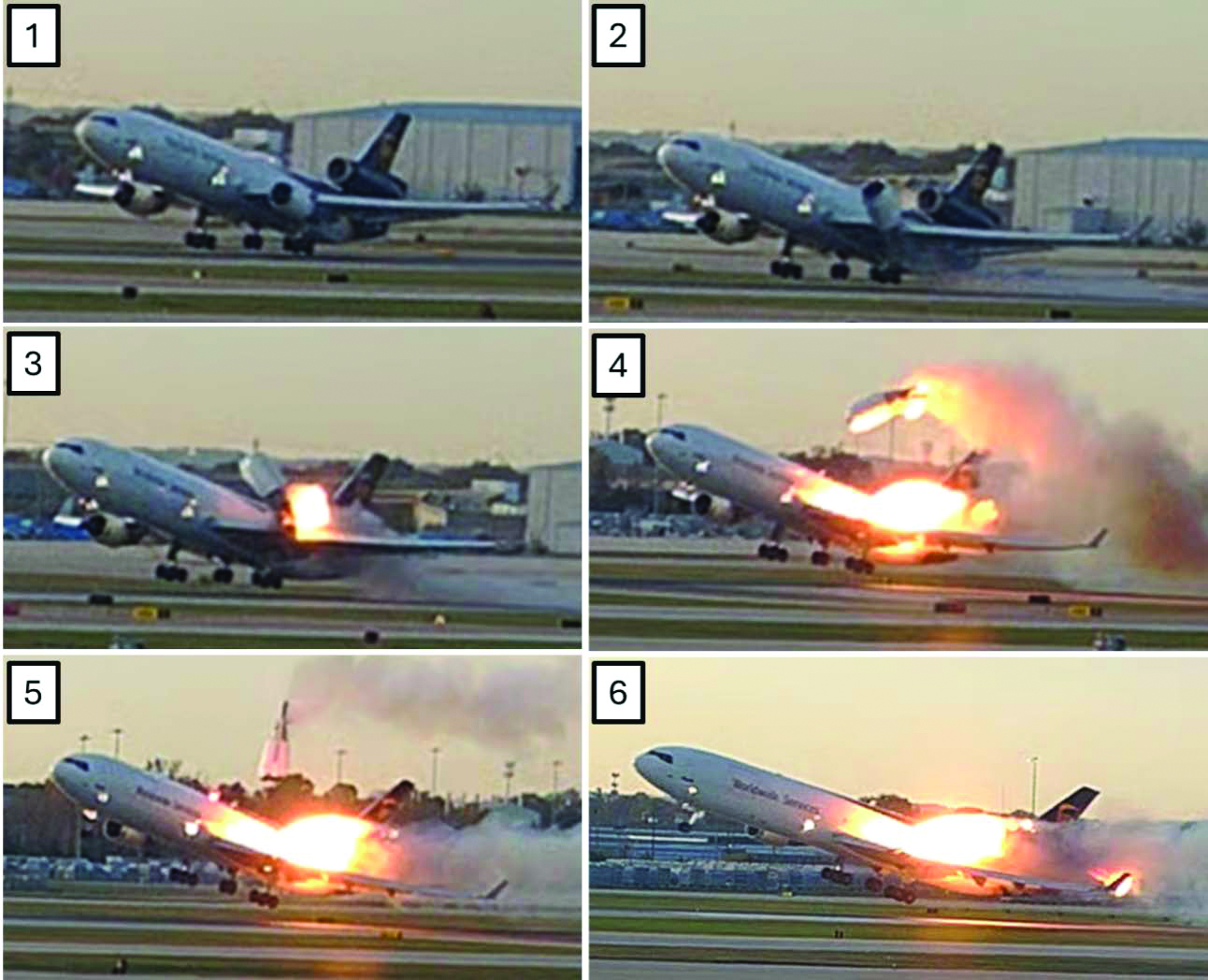 Still images from an airport surveillance video showing the left engine and left pylon separating from the left wing of the MD-11 aircraft on November 4, 2025. Photos courtesy of the NTSB report.