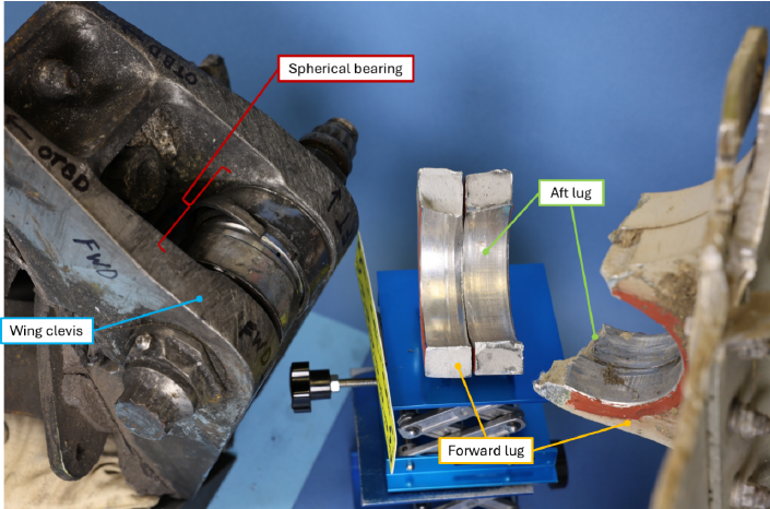 The left pylon aft mount, the fractured and separated forward and aft lugs, and the left wing clevis containing the attachment hardware and fractured spherical bearing. Photos courtesy of the NTSB report.