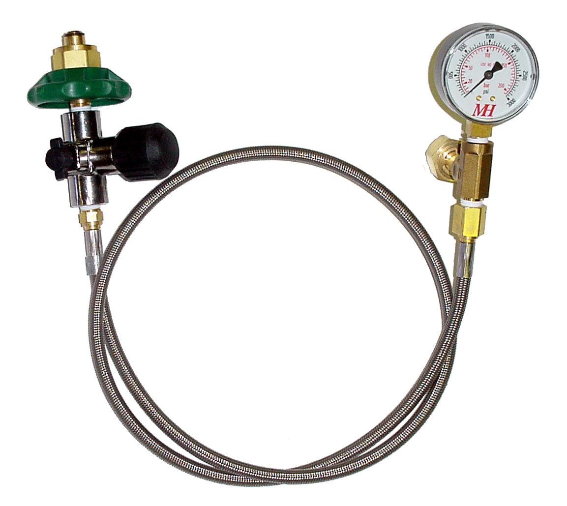 3. Install a transfill hose — a high-pressure hose with appropriate connectors and gauges. Mountain High provides an as­sortment of high-quality transfill hoses to get the job done. A model TR-95 is an easy-to-use transfill hose which features a gauge on one end as well as a bleed valve to easily release pressure in the line after filling to make disconnecting the hose simple. Find the TR-95 and other hoses at www.mhoxygen.com > Products > Ground Support Equipment > Transfillers.
