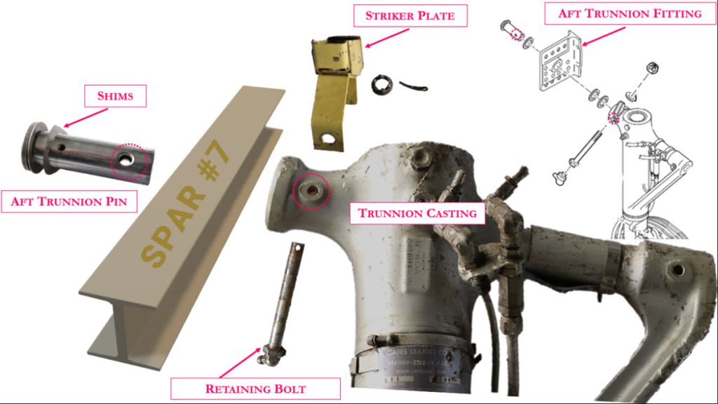 According to the NTSB report, the procedure to reinstall the gear must be followed explicitly. “If the [retaining] bolt is secured before engaging the pin in the trunnion casing, then the grease hole could be aft of the bushing, allowing grease to escape outside the pin, into the wing bay behind spar #7,” the NTSB said. “With the adjacent access panel removed, using a mirror, the pin can visibly be seen not making contact with the aft trunnion fitting when it is not fully pushed into the trunnion casing.”